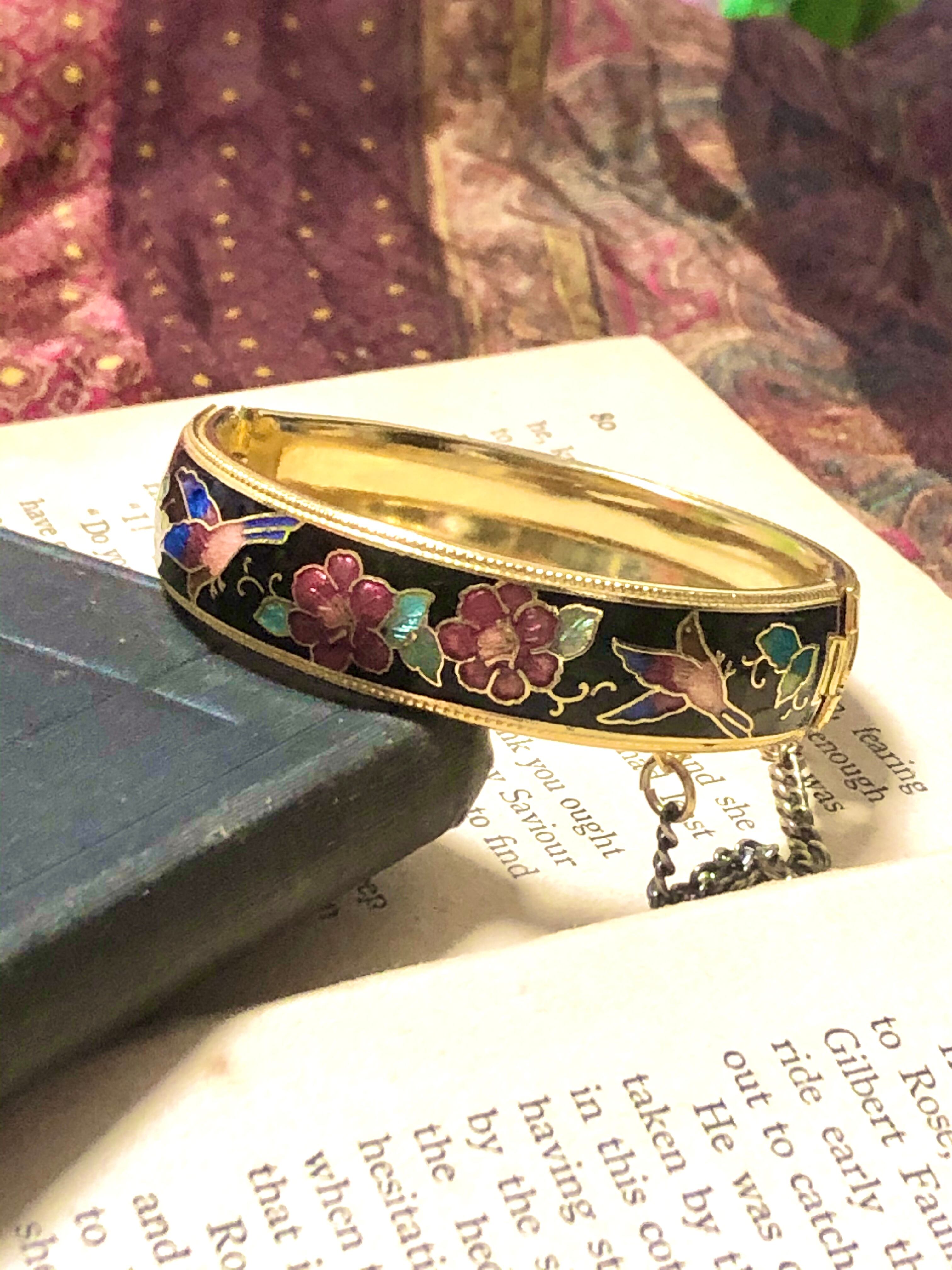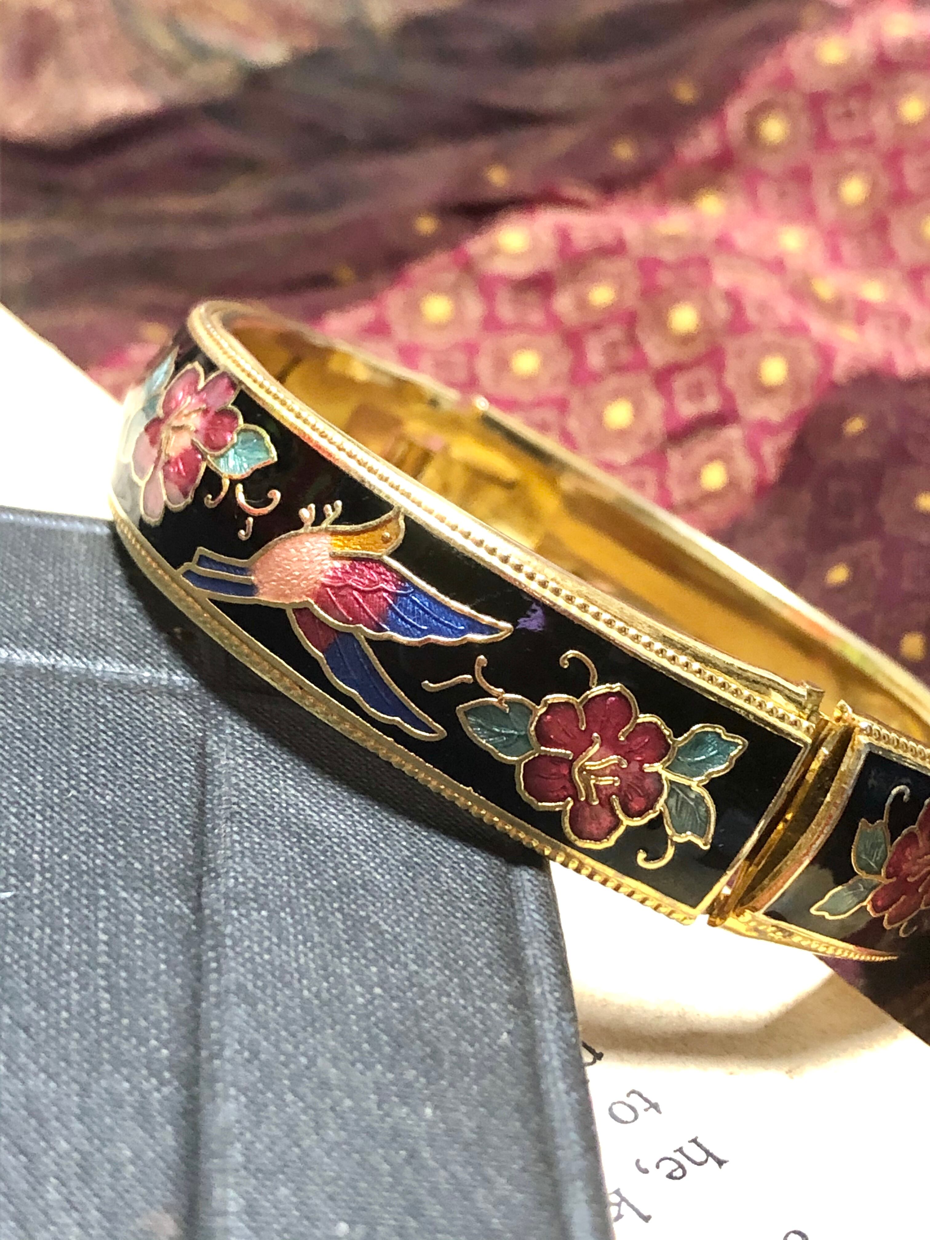 ブラックベースに美しい花や鳥の模様が入ったバングル。