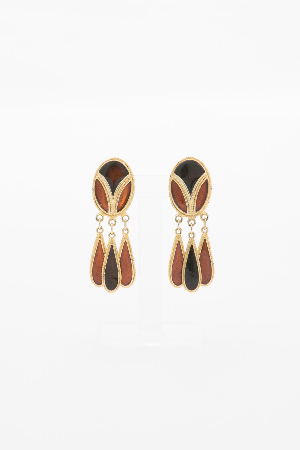 ブラウンとべっ甲色の組み合わせが美しい、ぶら下がりタイプのイヤリング。