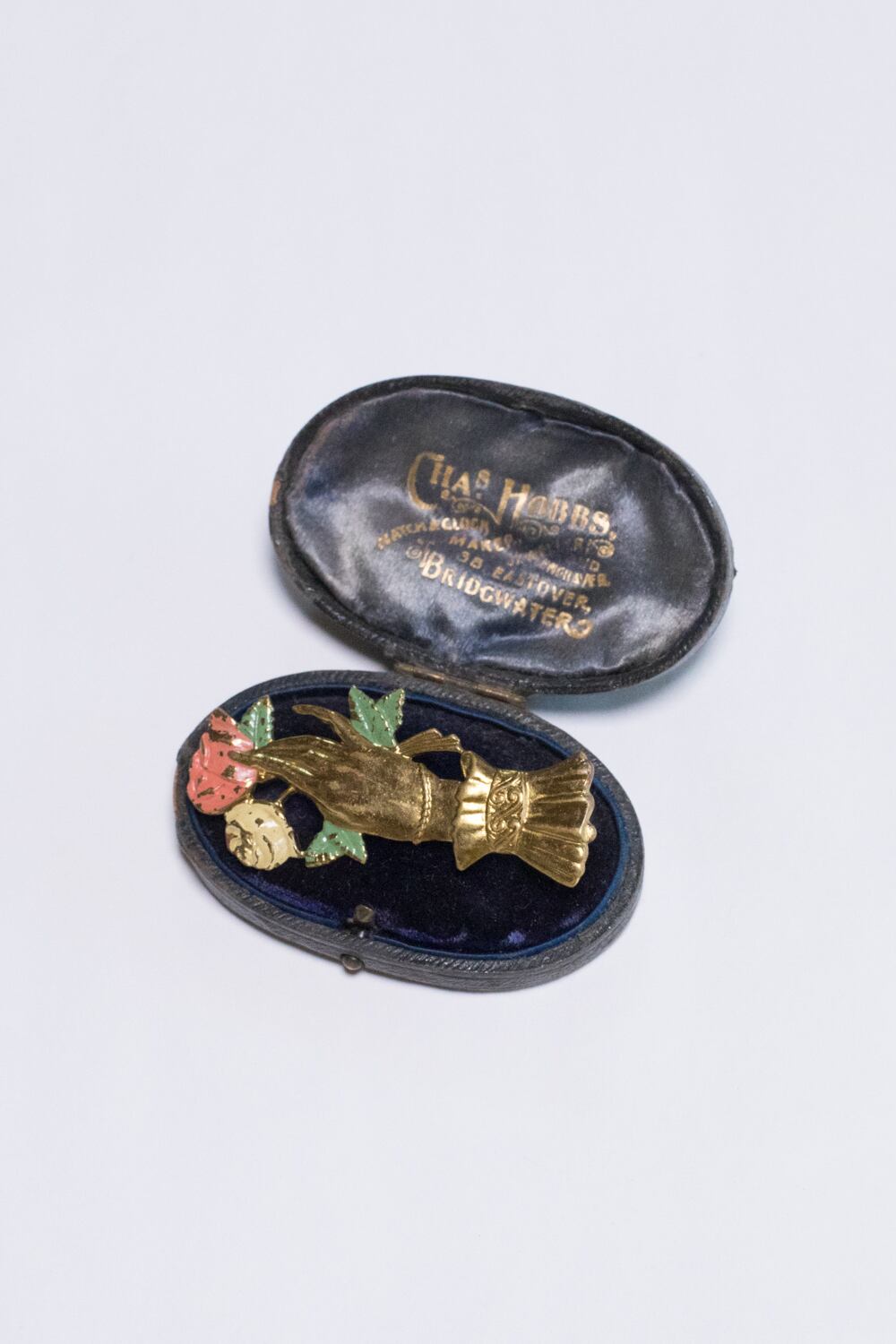 こちらのブローチはふわりとした袖口や細やかな装飾、写実的なしなやかな手のモチーフがとても美しく、赤白の薔薇の柔らかなペイントと落ち着いたゴールドカラーの輝きもヴィンテージならではの魅力をお楽しみ頂けます。