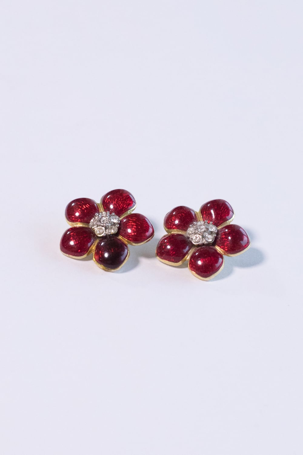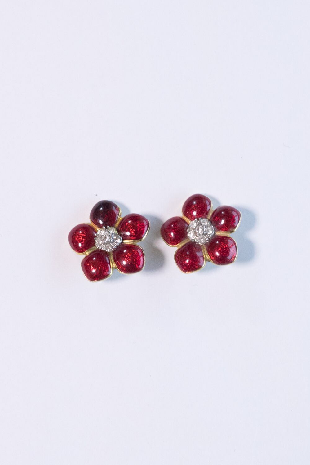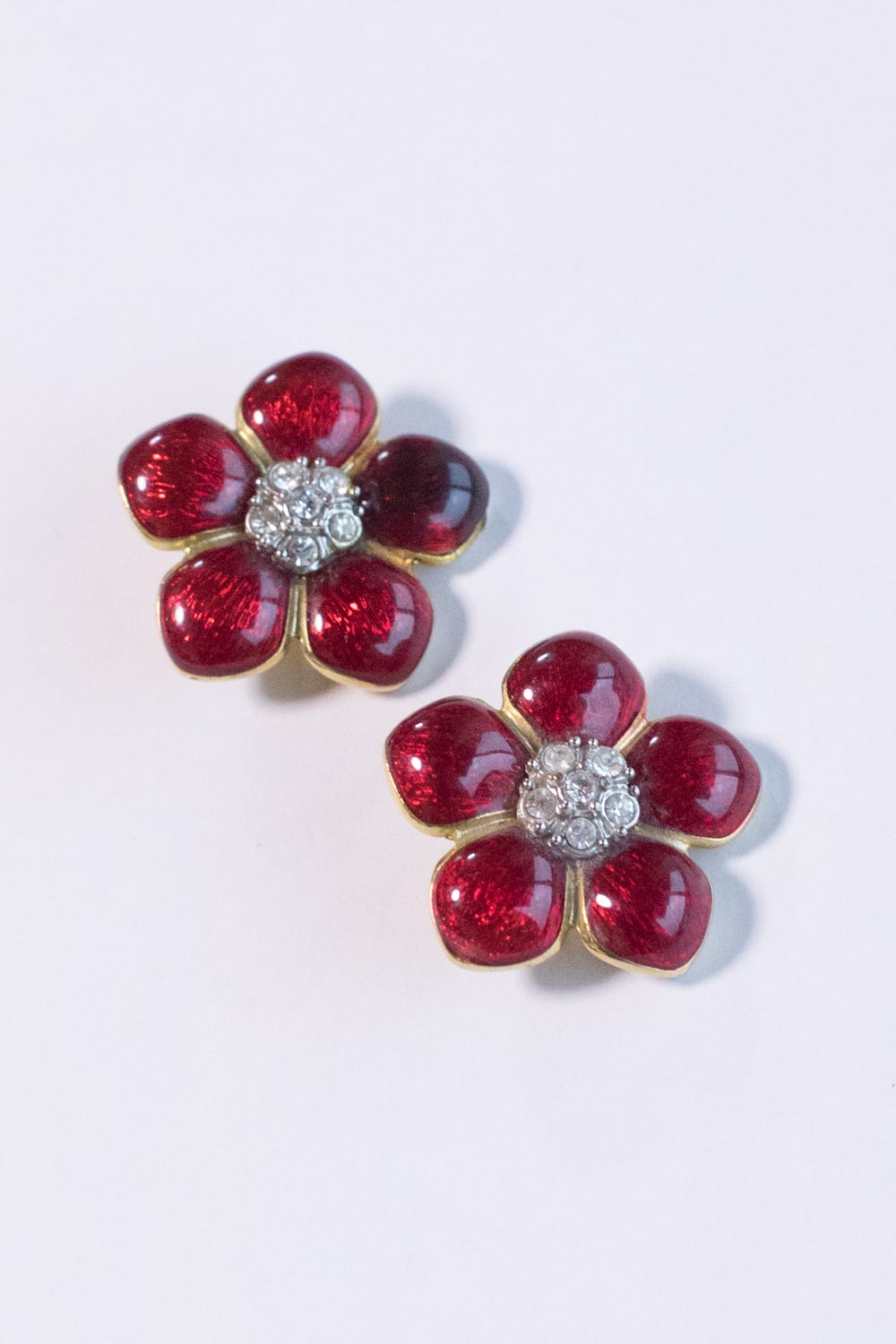 ゴールドトーンメタルの花が、赤エナメルとクリアグラスで彩られています。