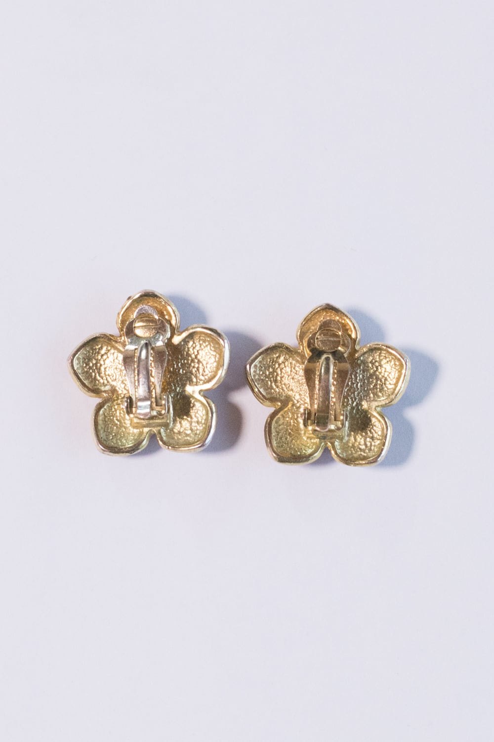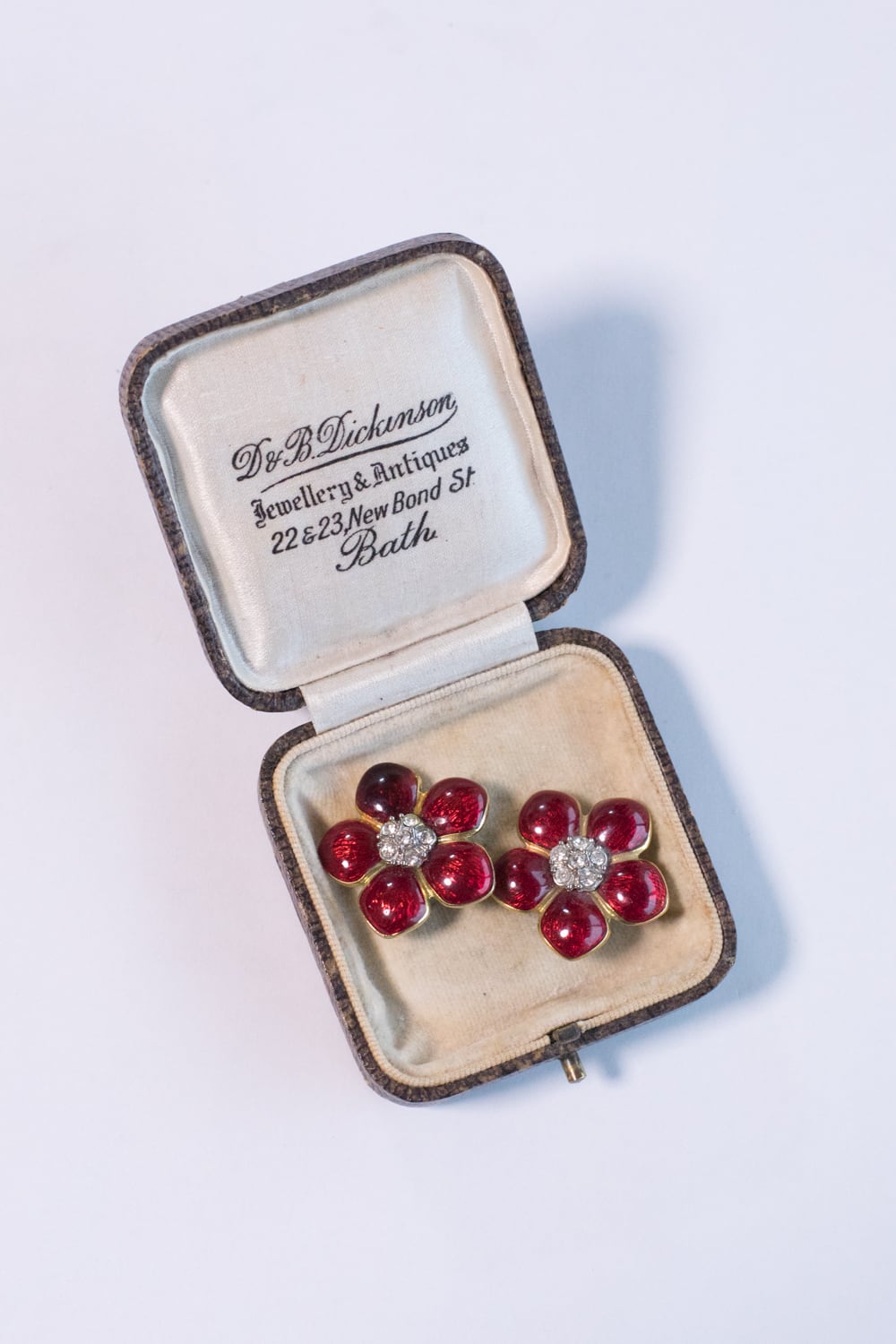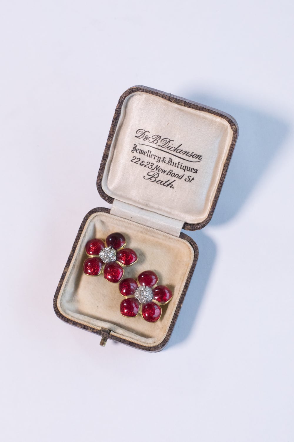 ゴールドトーンメタルの花が、赤エナメルとクリアグラスで彩られています。