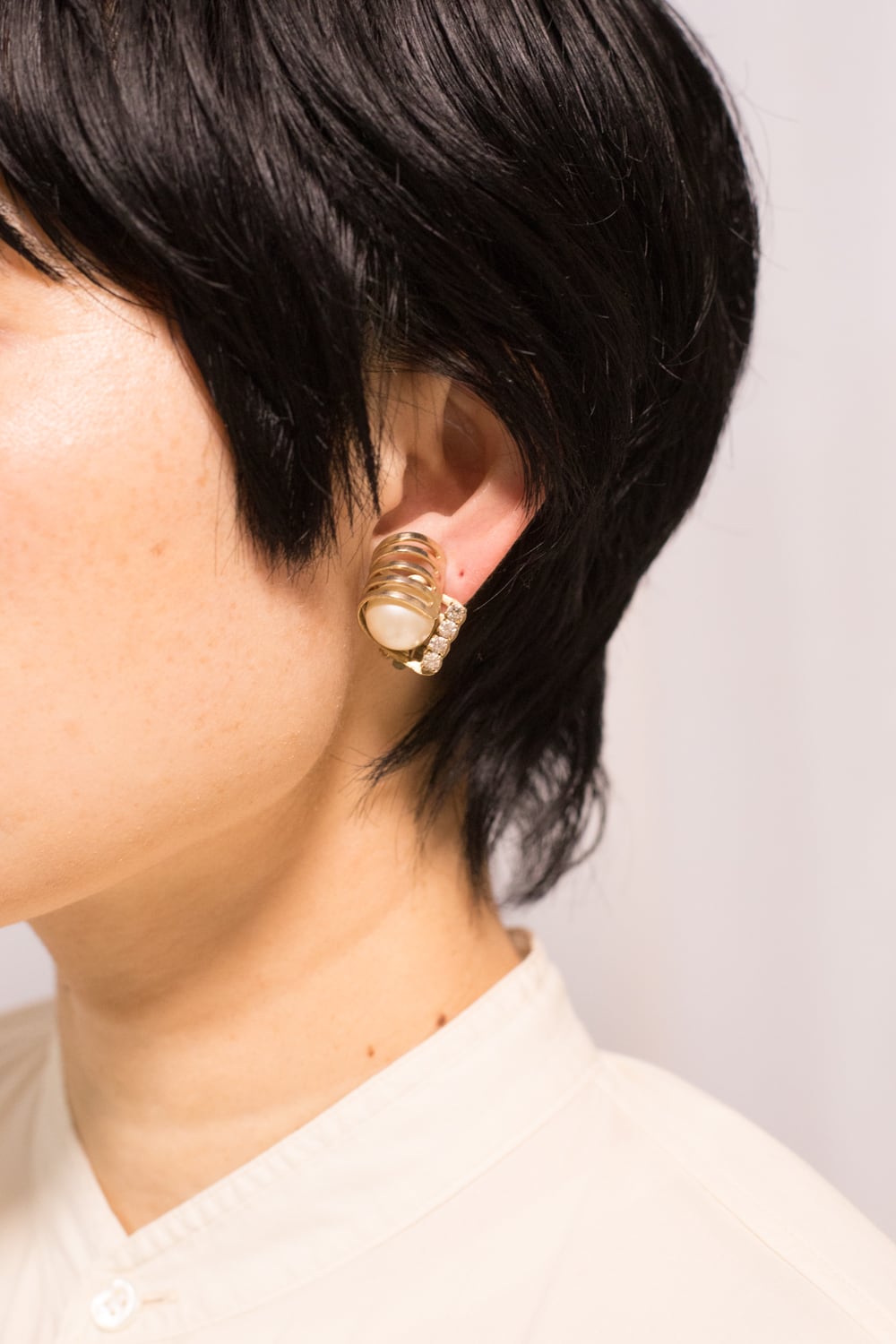パールのサイズ感とそれを包み込む立体的なつくり、並ぶラインストーンの角度、つけた時の全体の美しさが計算されております。